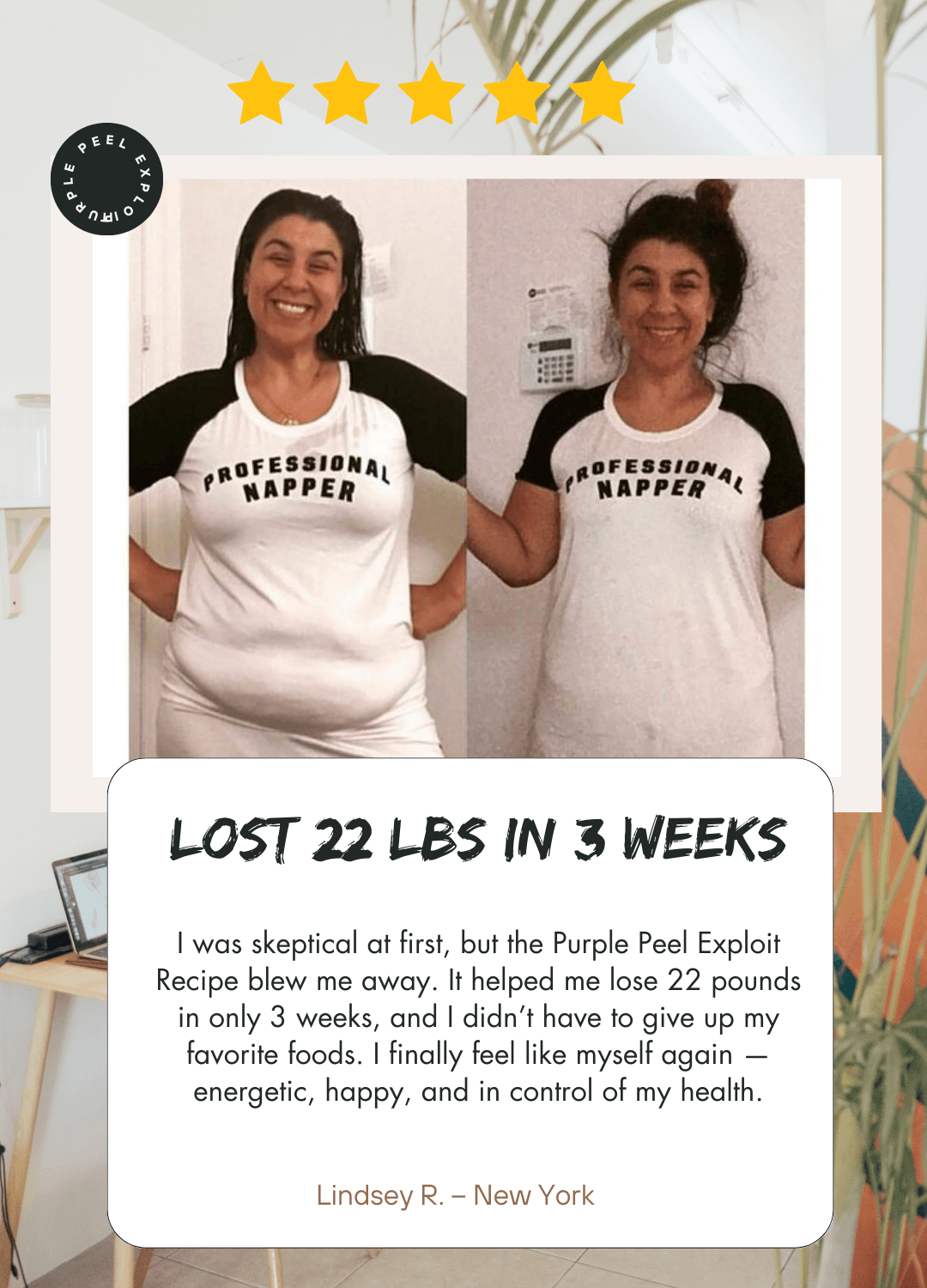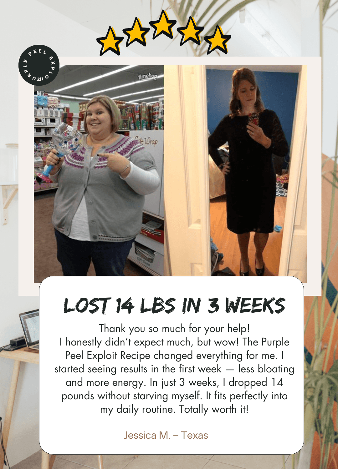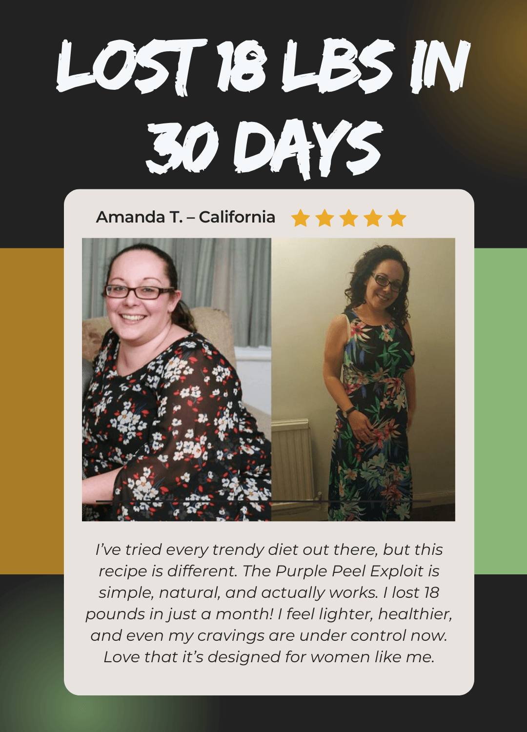 But then I came across a story on my news feed about a woman who was a little older than me and had lost over 100 lbs with the same 6-Second Purple Peel Exploit Ritual.